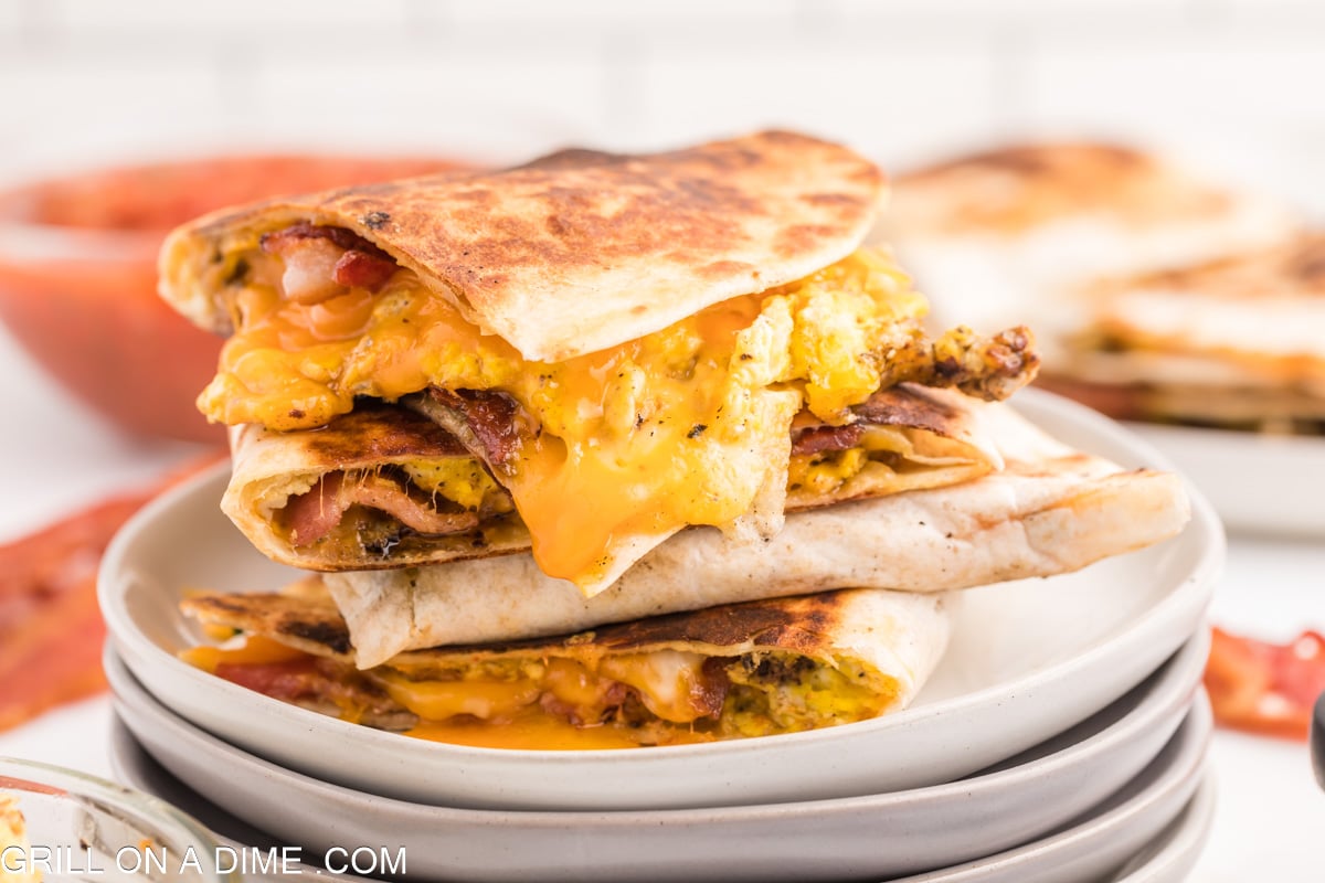 - Then place the tortillas on the grill. Top each tortilla with a small amount of each cheese, then layer the eggs and bacon on top and then add more cheese. Carefully fold each tortilla in half making a half moon shape.