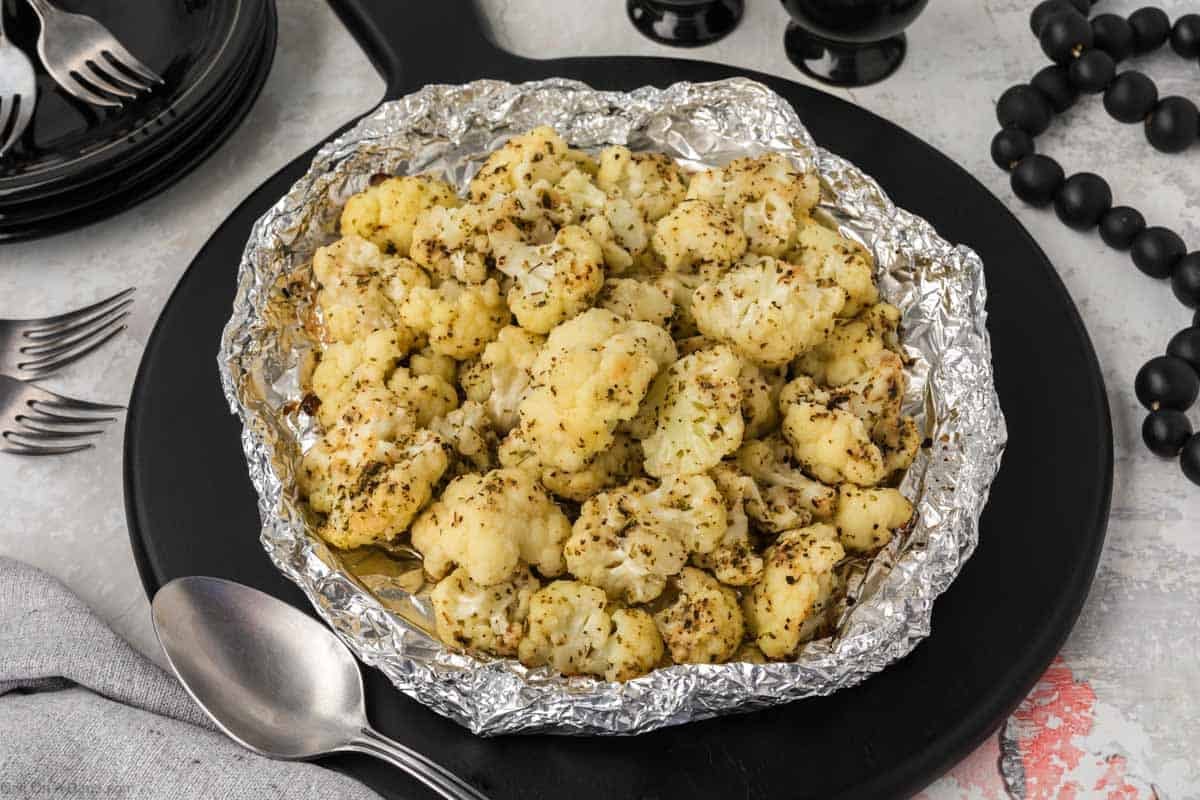 - Place the foil packet on the grill and cook for approximately 15-20 minutes until the cauliflower is tender. Be careful when opening the foil packet as steam will release from the pack.