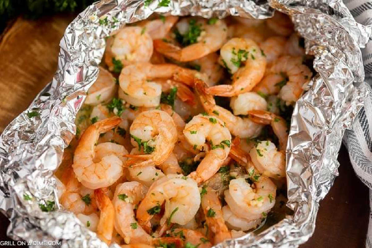 - Fold the foil around the shrimp and seal it tightly to form a foil packet.
